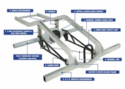1. Ladder Bar Frame Rails - Specially engineered profile clears suspension and axle components, while accommodating low ride height and wide tires. 2. 2" x 3" Crossmember - Mandrel bent for uniform profile; 3.5" drop center makes it adaptable to virtually any chassis design; 60" wide. 3. Diagonal Link - 3/4" o.d. DOM steel with 1/2" Spherical Rod Ends for easy, in-chassis adjustment. Driveshaft Loop - 1-1/8" o.d. Mandrel Bent Round Tube contains driveshaft during U-joint failure. 5.Shock Cro