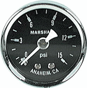 Shockproof Pressure gauges are 1-1/2" diameter with stainless steel cases and bezels. Gauges are available dry, glycerin-filled, or glycerin-filled with brass internals and "engine turned" faces. Gauges have 1/8" NPT connections on back.Engine Turned 0-30 PSI